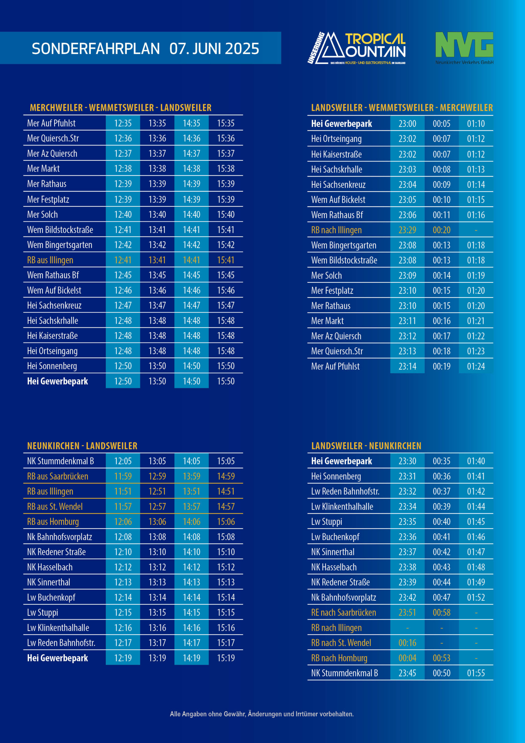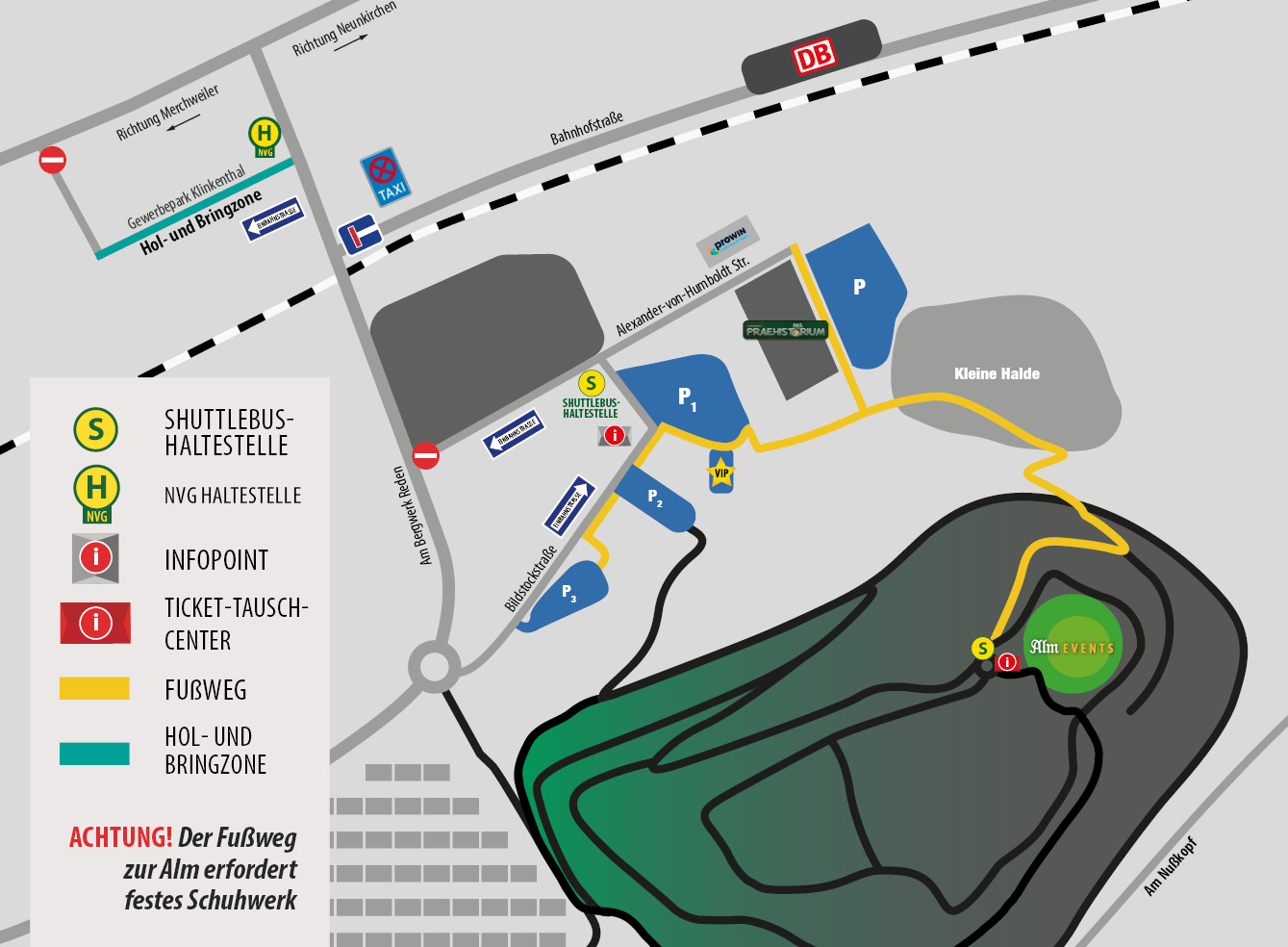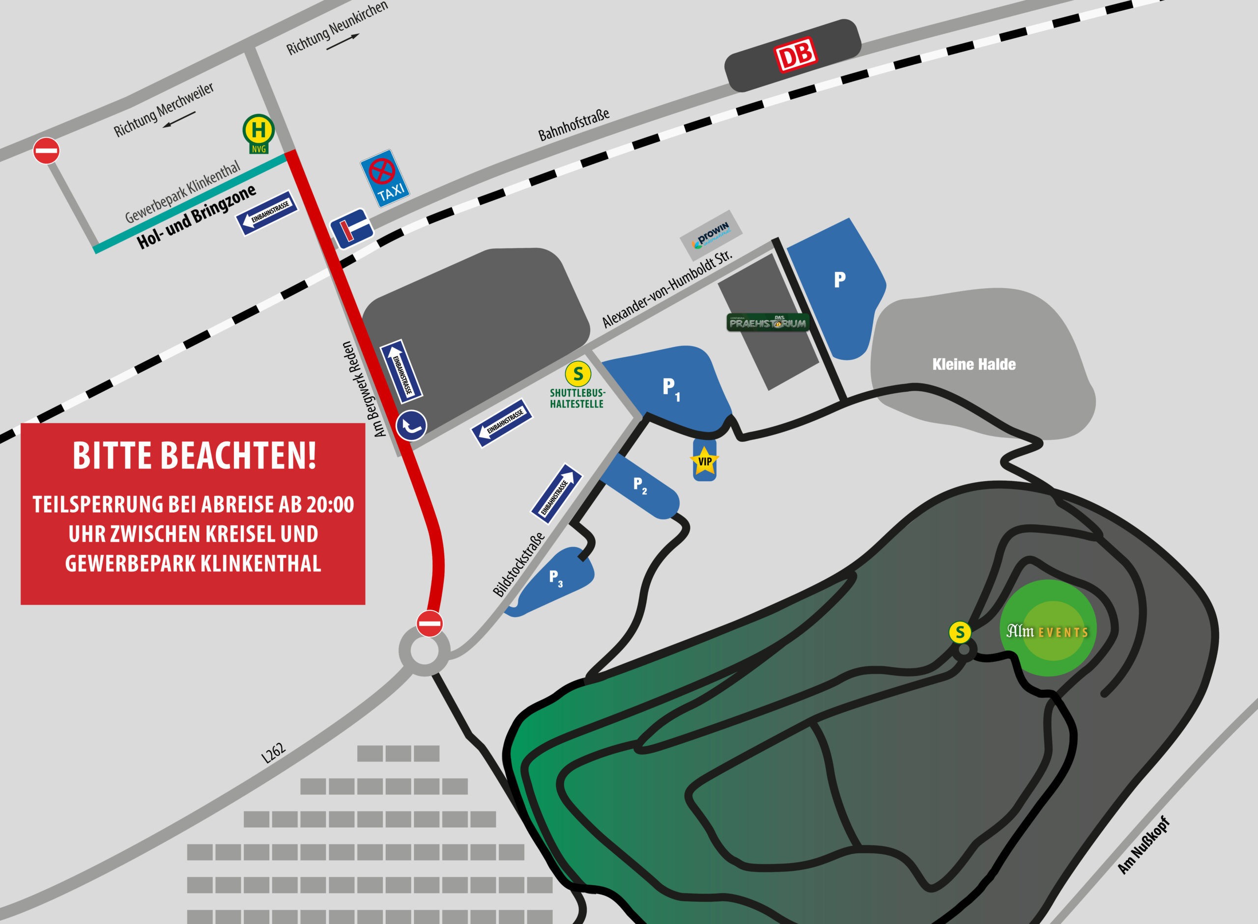 Auch in diesem Jahr wird es wieder eine geänderte Verkehrsführung rund um den Erlebnisort Reden am Pfingstwochenende geben anlässlich der Open Air Veranstaltungen auf der Alm. Bitte beachtet, dass es über das gesamte Wochenende eine Einbahnstraßenregelung vom Kreisel zu den Parkplätzen des Erlebnisort Reden (Bildstockstraße) geben wird. Der abfließende Verkehr von den Parkplätzen über die Alexander von Humboldt Straße erfolgt ausschließlich nach rechts in die Straße "Am Bergwerk Reden" und dort weiter in Richtungen Neunkirchen oder Heiligenwald. Festivalbesucher, die sich nach der Veranstaltung abholen lassen möchten, bitten wir zur gekennzeichneten "Hol- und Bringzone" im Gewerbepark Klinkenthal zu gehen. Dort sind extra Plätze für ankommende Autos ausgewiesen und dort wird auch in diesem Jahr die NVG-Bedarfshaltestelle für die kostenlosen Busse platziert sein.